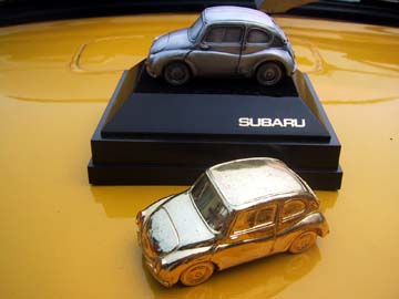 スバル360アンチモニー製ミニカー 奥は常連の谷澤くんが持ってきてくれたもので、スバルディーラーのノベルティとして配られたもののようです。ネットオークションで落札した物を当店で保管しています。 手前は確か『川端企画』さんから頂いた物で、金メッキしてあります。こっちのほうが貴重という噂もあり?? ふたつともデメキン(同じ金型)です。どなたか詳しい方がいらっしゃいましたら当店までご一報ください。